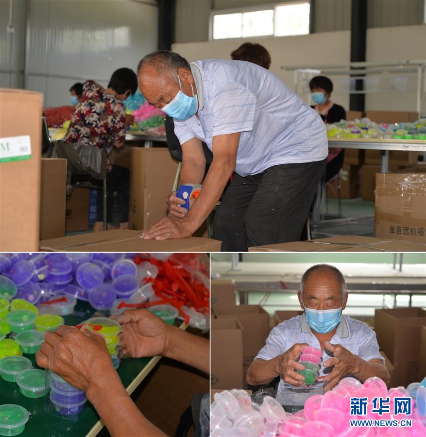 這是一張拼版照片(圖片均為5月16日攝)。上圖:在河南省開封市尉氏縣大橋鄉(xiāng)馮村扶貧車間,65歲的鄭春嶺用膠帶把裝滿玩具的紙箱封上。依靠村內扶貧車間,他走上致富的道路;下左圖、下右圖:鄭春嶺在打包玩具。新華社記者孫清清攝