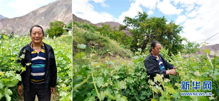拼版照片:左圖為西藏昌都市芒康縣木許鄉(xiāng)阿東村村民楊培;右圖為楊培在葡萄園里忙碌。近年來(lái),芒康縣大力發(fā)展葡萄種植,成為群眾脫貧增收的“甜蜜”產(chǎn)業(yè)。楊培在村里種了3.5畝葡萄,2019年出售葡萄賺了8000多元。以前,楊培只種青稞和玉米,除了自給自足,幾乎沒(méi)有經(jīng)濟(jì)收益(5月6日攝)。新華社記者詹彥攝