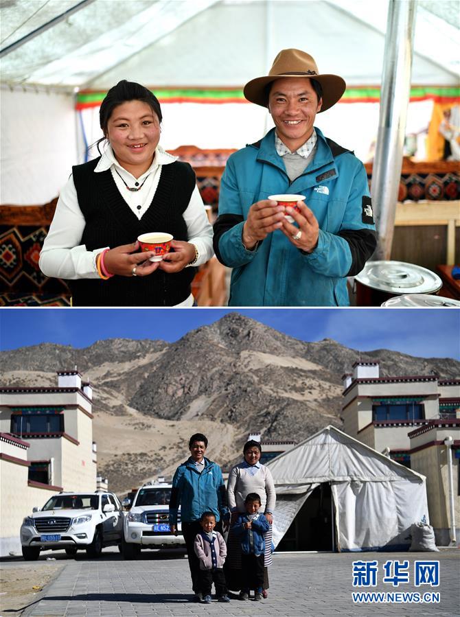 拼版照片上圖:在森布日極高海拔地區(qū)生態(tài)搬遷安置點(diǎn),格多(右)和妻子洛巴在展示自家打的酥油茶;下圖:在森布日極高海拔地區(qū)生態(tài)搬遷安置點(diǎn),格多(后左)和妻子洛巴及大兒子扎西尼瑪(前右)、小兒子普巴多杰在帳篷茶館前合影(照片均攝于4月15日)。格多的老家在西藏那曲市安多縣色務(wù)鄉(xiāng),一個(gè)藏北偏遠(yuǎn)的牧區(qū)。2019年底,政府對(duì)平均海拔4500米以上的那曲市安多縣、雙湖縣進(jìn)行極高海拔地區(qū)生態(tài)搬遷。和格多一家一樣,安多縣、雙湖縣搬遷下來(lái)的4000余名群眾完成了人生的遷徙,開啟了更加美好的生活。黨的十八大以來(lái),我們堅(jiān)持以人民為中心的發(fā)展思想,明確了到2020年我國(guó)現(xiàn)行標(biāo)準(zhǔn)下農(nóng)村貧困人口實(shí)現(xiàn)脫貧、貧困縣全部摘帽、解決區(qū)域性整體貧困的目標(biāo)任務(wù)。目前看,脫貧進(jìn)度符合預(yù)期,成就舉世矚目。這些成績(jī)的取得,凝聚了全黨全國(guó)各族人民智慧和心血,是廣大干部群眾扎扎實(shí)實(shí)干出來(lái)的。脫貧摘帽不是終點(diǎn),而是新生活、新奮斗的起點(diǎn)。新華社記者詹彥攝