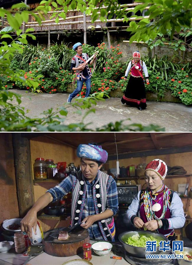 拼版照片上圖:郁伍林和魯冰花在客棧院子里彈唱歌舞(2017年5月27日攝);下圖:郁伍林和魯冰花為客人準(zhǔn)備晚餐(2017年5月26日攝)。云南省怒江傈僳族自治州福貢縣匹河怒族鄉(xiāng)老姆登村的郁伍林和妻子魯冰花,是該村開辦農(nóng)家樂和客棧的致富帶頭人。夫妻倆還創(chuàng)建了茶葉品牌,幫助老姆登村怒族群眾把種植的生態(tài)茶葉銷往國(guó)內(nèi)外。在他們的引導(dǎo)和帶動(dòng)下,山寨的父老鄉(xiāng)親通過經(jīng)營(yíng)農(nóng)家樂客棧和種植茶葉逐步脫貧致富,日子越過越紅火。黨的十八大以來,我們堅(jiān)持以人民為中心的發(fā)展思想,明確了到2020年我國(guó)現(xiàn)行標(biāo)準(zhǔn)下農(nóng)村貧困人口實(shí)現(xiàn)脫貧、貧困縣全部摘帽、解決區(qū)域性整體貧困的目標(biāo)任務(wù)。目前看,脫貧進(jìn)度符合預(yù)期,成就舉世矚目。這些成績(jī)的取得,凝聚了全黨全國(guó)各族人民智慧和心血,是廣大干部群眾扎扎實(shí)實(shí)干出來的。脫貧摘帽不是終點(diǎn),而是新生活、新奮斗的起點(diǎn)。新華社記者楊宗友攝