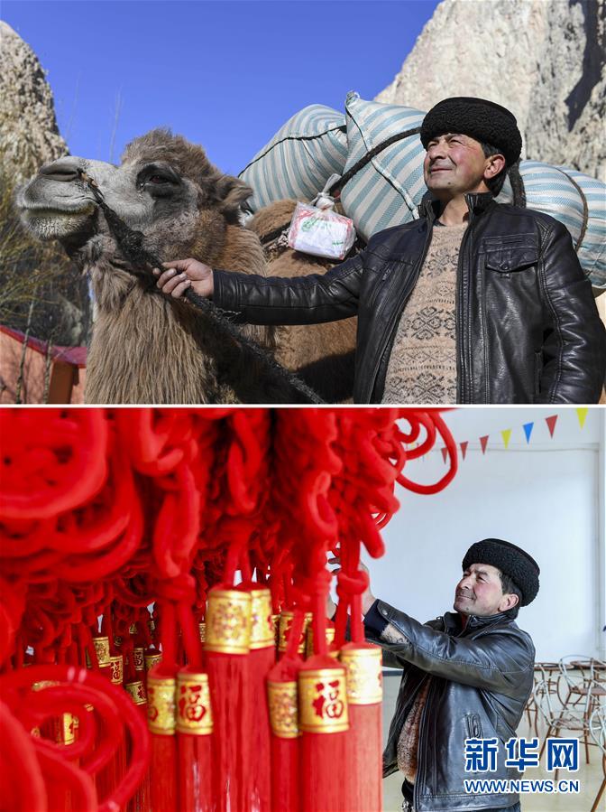 拼版照片上圖:都熱·加爾曼牽著馱有搬遷行李的駱駝走在喀喇昆侖山中(2018年11月17日攝);在塔什庫(kù)爾干塔吉克自治縣塔提庫(kù)力易地扶貧搬遷安置點(diǎn)的衛(wèi)星工廠,都熱·加爾曼在參觀由村民編制的手工藝品,他計(jì)劃讓妻子來這里上班(2018年11月18日攝)。2018年以來,新疆塔什庫(kù)爾干塔吉克自治縣對(duì)居住在艱苦偏遠(yuǎn)山區(qū)、生產(chǎn)生活資料匱乏、難以實(shí)現(xiàn)就地脫貧的358戶貧困戶,陸續(xù)實(shí)施易地扶貧搬遷,搬遷至距縣城約25公里的塔提庫(kù)力易地扶貧搬遷安置點(diǎn)。安置點(diǎn)還開發(fā)了耕地、草場(chǎng),建有衛(wèi)星工廠,確保像都熱一樣的貧困戶能穩(wěn)步增收脫貧。黨的十八大以來,我們堅(jiān)持以人民為中心的發(fā)展思想,明確了到2020年我國(guó)現(xiàn)行標(biāo)準(zhǔn)下農(nóng)村貧困人口實(shí)現(xiàn)脫貧、貧困縣全部摘帽、解決區(qū)域性整體貧困的目標(biāo)任務(wù)。目前看,脫貧進(jìn)度符合預(yù)期,成就舉世矚目。這些成績(jī)的取得,凝聚了全黨全國(guó)各族人民智慧和心血,是廣大干部群眾扎扎實(shí)實(shí)干出來的。脫貧摘帽不是終點(diǎn),而是新生活、新奮斗的起點(diǎn)。新華社記者胡虎虎攝