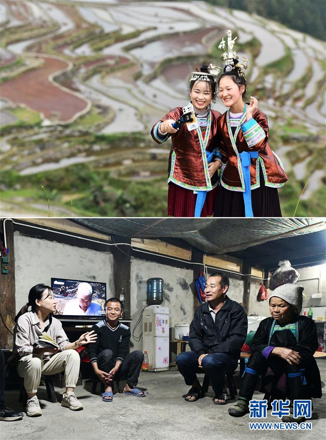 拼版照片上圖:吳賢艷(左)與村里的大一女生梁瓊英在直播推介加榜梯田風(fēng)光(4月19日攝);下圖:吳賢艷(左一)夜訪貧困戶(4月18日攝)。從江縣是貴州省深度貧困縣之一。1994年出生的從江縣侗族女孩吳賢艷在2017年大學(xué)畢業(yè)后回到月亮山區(qū)。2019年3月,她成為從江縣加榜鄉(xiāng)加車村脫貧攻堅(jiān)指揮所的一名網(wǎng)格員。吳賢艷和其他駐村干部不僅會(huì)主動(dòng)幫助缺少勞動(dòng)力的農(nóng)戶,還利用閑暇時(shí)間通過網(wǎng)絡(luò)平臺(tái),向山外推介美麗的加榜梯田和苗寨風(fēng)光,吸引更多的游客來旅游,為村民們脫貧增收出謀劃策。黨的十八大以來,我們堅(jiān)持以人民為中心的發(fā)展思想,明確了到2020年我國(guó)現(xiàn)行標(biāo)準(zhǔn)下農(nóng)村貧困人口實(shí)現(xiàn)脫貧、貧困縣全部摘帽、解決區(qū)域性整體貧困的目標(biāo)任務(wù)。目前看,脫貧進(jìn)度符合預(yù)期,成就舉世矚目。這些成績(jī)的取得,凝聚了全黨全國(guó)各族人民智慧和心血,是廣大干部群眾扎扎實(shí)實(shí)干出來的。脫貧摘帽不是終點(diǎn),而是新生活、新奮斗的起點(diǎn)。新華社記者楊文斌攝