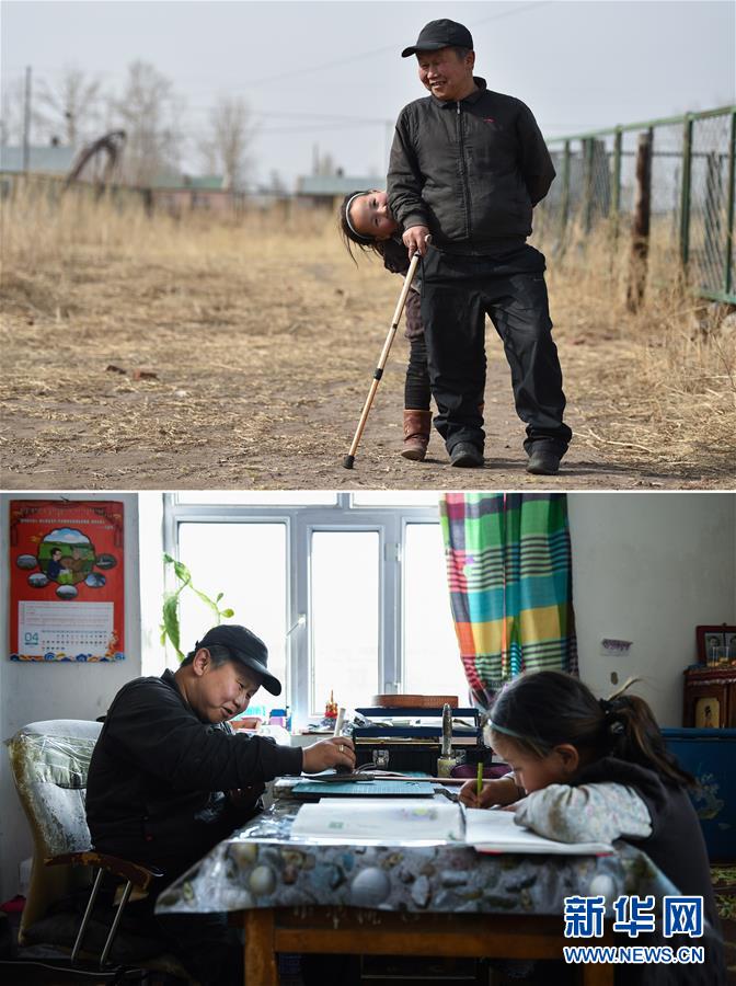 拼版照片上圖:在錫尼河鎮(zhèn)的出租房外,米格木爾(前)和女兒南吉樂瑪一起玩耍;下圖:在錫尼河鎮(zhèn)的出租房?jī)?nèi),米格木爾在進(jìn)行皮雕,女兒南吉樂瑪在溫習(xí)功課(照片均攝于4月15日)。2016年,家住內(nèi)蒙古鄂溫克族自治旗錫尼河鎮(zhèn)孟根礎(chǔ)魯嘎查的米格木爾因?yàn)槿笔趧?dòng)能力成了建檔立卡貧困戶。獨(dú)自撫養(yǎng)女兒的他為了女兒上學(xué)離開了牧區(qū)來到鎮(zhèn)上租房陪讀,生活的壓力讓米格木爾犯了難。2018年春天,他通過當(dāng)?shù)孛褡逦幕a(chǎn)業(yè)創(chuàng)業(yè)園舉辦的皮雕手藝培訓(xùn),讓他居家賺錢、陪讀兩不誤,逐步實(shí)現(xiàn)穩(wěn)定脫貧。2020年4月,我國(guó)第一個(gè)成立的少數(shù)民族自治區(qū)——內(nèi)蒙古自治區(qū)宣告全面脫貧“摘帽”。黨的十八大以來,我們堅(jiān)持以人民為中心的發(fā)展思想,明確了到2020年我國(guó)現(xiàn)行標(biāo)準(zhǔn)下農(nóng)村貧困人口實(shí)現(xiàn)脫貧、貧困縣全部摘帽、解決區(qū)域性整體貧困的目標(biāo)任務(wù)。目前看,脫貧進(jìn)度符合預(yù)期,成就舉世矚目。這些成績(jī)的取得,凝聚了全黨全國(guó)各族人民智慧和心血,是廣大干部群眾扎扎實(shí)實(shí)干出來的。脫貧摘帽不是終點(diǎn),而是新生活、新奮斗的起點(diǎn)。新華社記者劉磊攝