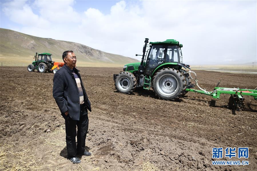 在青海省海北藏族自治州海晏縣青海湖鄉(xiāng)同寶村,者成倉準備播種(5月13日攝)。新華社記者張宏祥攝