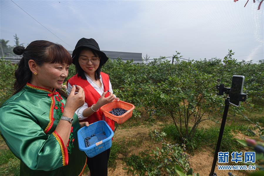 5月20日,長興縣林城鎮(zhèn)上獅村的藍莓種植幫扶基地內(nèi),青年志愿者與種植戶通過手機直播藍莓的采摘,并介紹當(dāng)?shù)厮{莓生長環(huán)境和品質(zhì),進行網(wǎng)上銷售。新華社記者徐昱攝