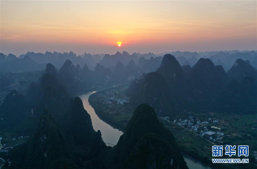 這是在廣西桂林市陽朔縣興坪鎮(zhèn)拍攝的山水風(fēng)光(5月19日攝,無人機(jī)照片)?!吧n蒼森八桂,茲地在湘南。江作青羅帶,山如碧玉篸……”一千多年前,唐朝詩人韓愈寫盡桂林山水之美。初夏時(shí)節(jié),在廣西桂林市陽朔縣興坪鎮(zhèn),藍(lán)天白云下,煙雨朦朧中,桂林山水盡顯秀美。新華社記者 曹祎銘 攝