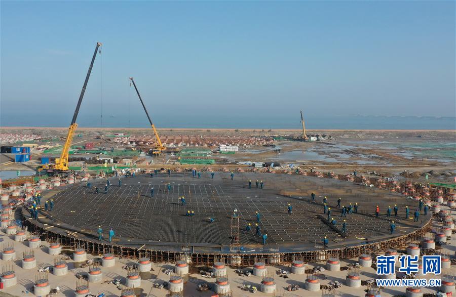 5月23日,工人在唐山市曹妃甸區(qū)LNG項(xiàng)目第一階段工程儲(chǔ)罐建設(shè)工地施工(無人機(jī)照片)。