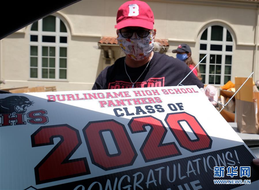 5月22日,在美國(guó)加州北部圣馬特奧縣,工作人員歡迎來辦理畢業(yè)手續(xù)的學(xué)生。新華社記者吳曉凌攝