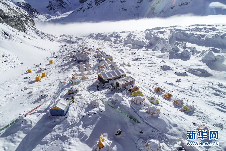 位于珠峰東絨布冰川旁海拔6500米的珠峰前進(jìn)營地(5月22日攝,無人機照片)。新華社記者晉美多吉攝