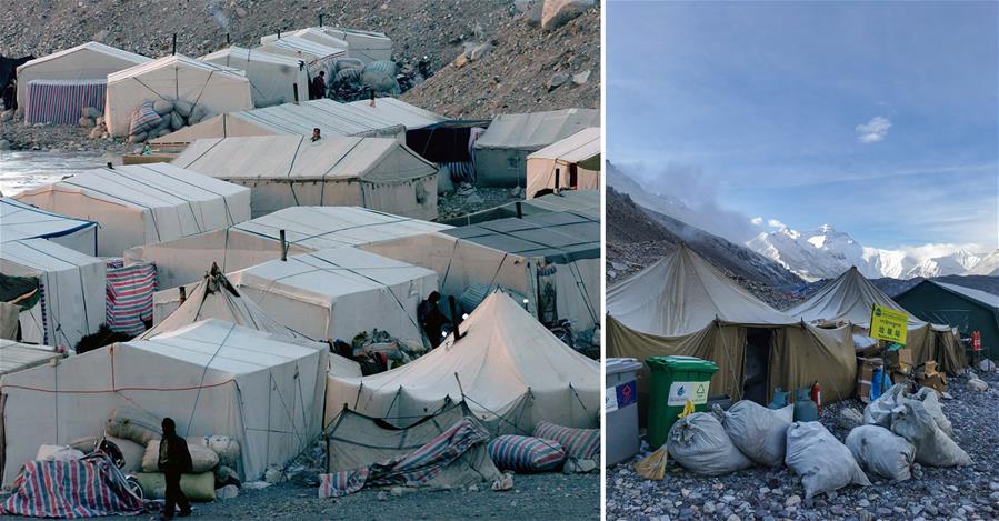 拼版照片:左圖為2005年的春季登山季,為測量、登山和科考等隊伍提供服務(wù)保障的當?shù)厝罕娫谥榉宕蟊緺I搭起的帳篷(資料照片)。新華社記者索朗羅布攝右圖為2020珠峰高程測量活動中,曾經(jīng)被視為登山隊最好的帳篷變成了垃圾集中存放處。新華社記者普布扎西攝