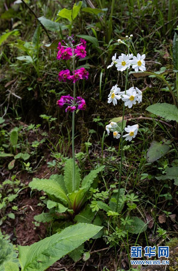 在四川省漢源縣桌子山,一株紅色的報(bào)春花旁生長(zhǎng)著一株白色的報(bào)春花(5月24日攝)。新華社記者江宏景攝