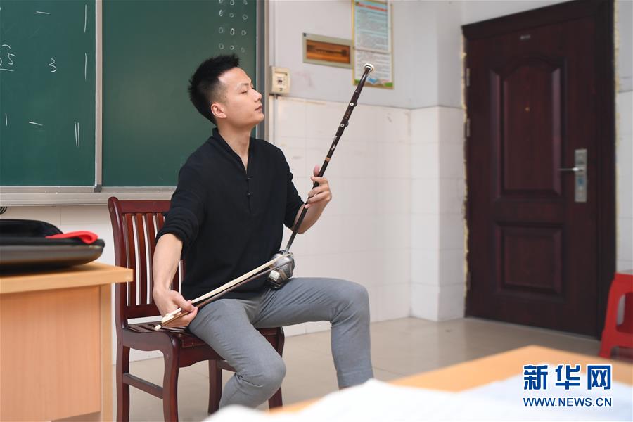 在湖南省湘西土家族苗族自治州,戴發(fā)在瀘溪縣第五中學教室內演奏二胡(5月22日攝)。新華社記者薛宇舸攝