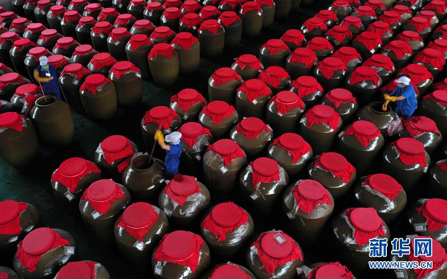 5月26日,工人在貴州省黔東南苗族侗族自治州麻江縣明洋食品公司生產車間攪拌釀造過程中的酸湯原料。