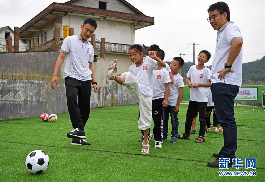 5月27日,在江西省貴溪市金屯鎮(zhèn)金屯村渡坊村小組,志愿者和留守兒童一起進(jìn)行體育活動。新華社記者萬象攝
