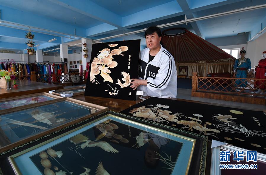 5月19日,在新疆博湖縣,一家民族工藝品公司的負(fù)責(zé)人杜玉新向參觀者介紹蘆葦工藝畫的制作工藝。新華社記者宋彥樺攝