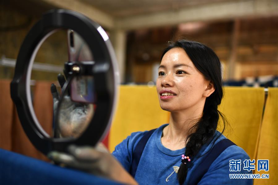 楊成蘭在用手機對侗族土布植物染色技藝進行網(wǎng)絡直播(5月28日攝)。