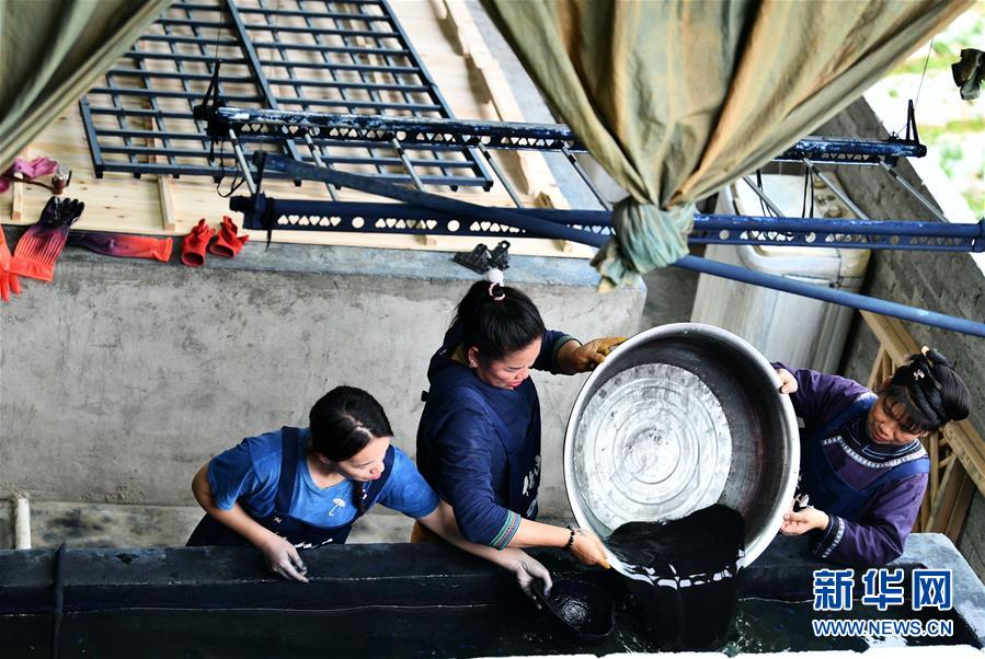 2018年,楊成蘭在村里成立傳統(tǒng)織染合作社,吸引村里及周邊村寨貧困戶入股,帶動當?shù)刎毨艉痛迕窦尤牒献魃?,從事織布、染布、藍靛種植等產(chǎn)業(yè),在傳承民族傳統(tǒng)手工技藝的同時,幫助村民脫貧增收。新華社記者楊文斌攝