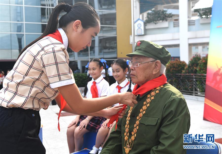 5月29日,少先隊員給李延年戴上紅領(lǐng)巾。“六一”國際兒童節(jié)來臨之際,“共和國勛章”獲得者、老一輩戰(zhàn)斗英雄李延年來到廣西南寧市濱湖路小學(xué)給孩子們講述戰(zhàn)爭年代的紅色故事,寄語他們好好學(xué)習(xí)、努力奮斗。孩子們向李延年贈送了師生共繪的“紅色畫卷”,向老英雄致敬。新華社記者周華攝