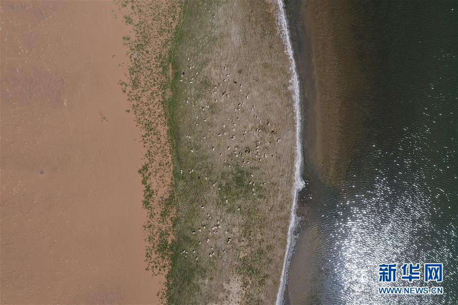 5月31日,羊群在巴丹吉林沙漠音德日?qǐng)D湖湖畔休憩(無人機(jī)照片)。新華社記者徐欽攝。