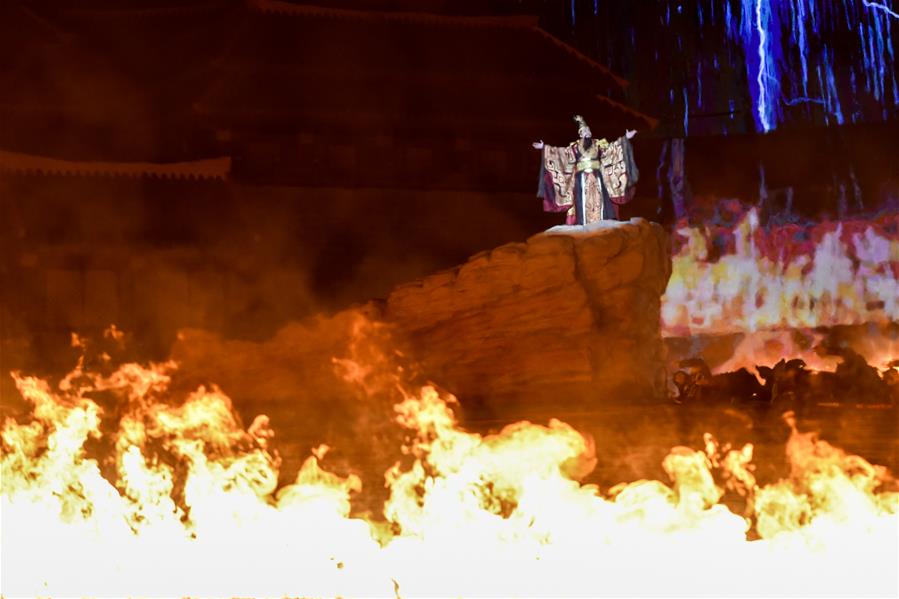5月28日,演員在大型實(shí)景神話音樂(lè)劇《昆侖之約》中表演。5月28日,新疆文化旅游新名片——大型實(shí)景神話音樂(lè)劇《昆侖之約》在烏魯木齊南山景區(qū)上演。該劇融自然山水之美、藝術(shù)文化之光、現(xiàn)代科技之新于一體,為市民獻(xiàn)上一場(chǎng)視聽(tīng)盛宴。新華社記者丁磊攝。