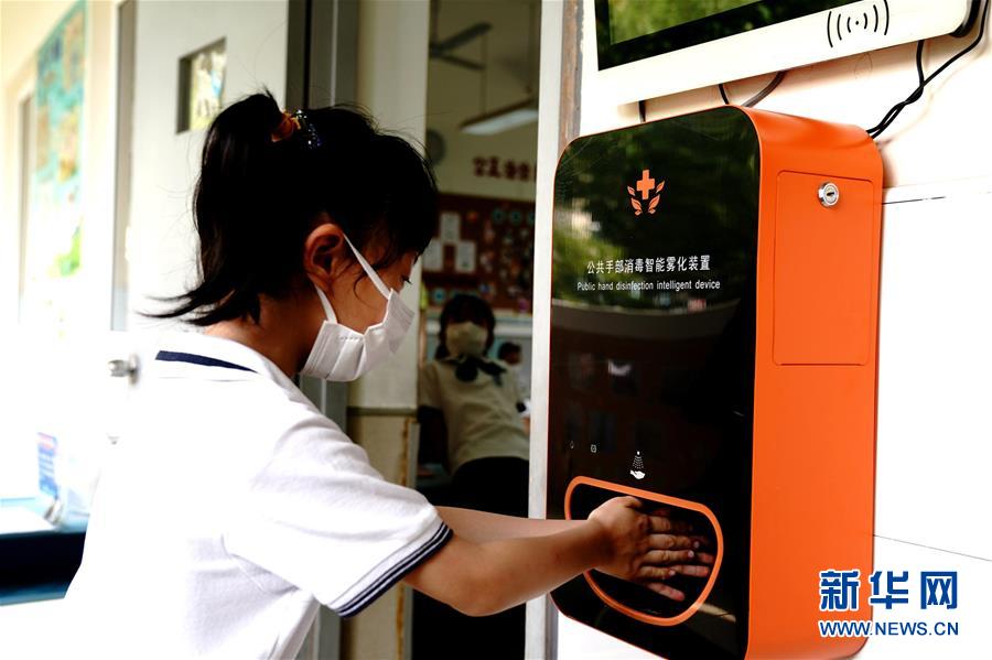 6月2日,上海閔行區(qū)鑫都小學(xué),一名小學(xué)生使用手部消毒智能霧化裝置。當(dāng)日,上海小學(xué)一、二、三年級(jí)學(xué)生返校開(kāi)學(xué)。新華社記者張建松攝。