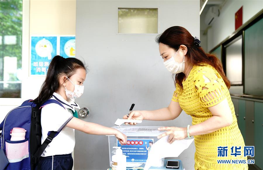 6月2日,上海閔行區(qū)鑫都小學(xué),老師為一名一年級(jí)小學(xué)生量體溫。當(dāng)日,上海小學(xué)一、二、三年級(jí)學(xué)生返校開(kāi)學(xué)。新華社記者張建松攝。