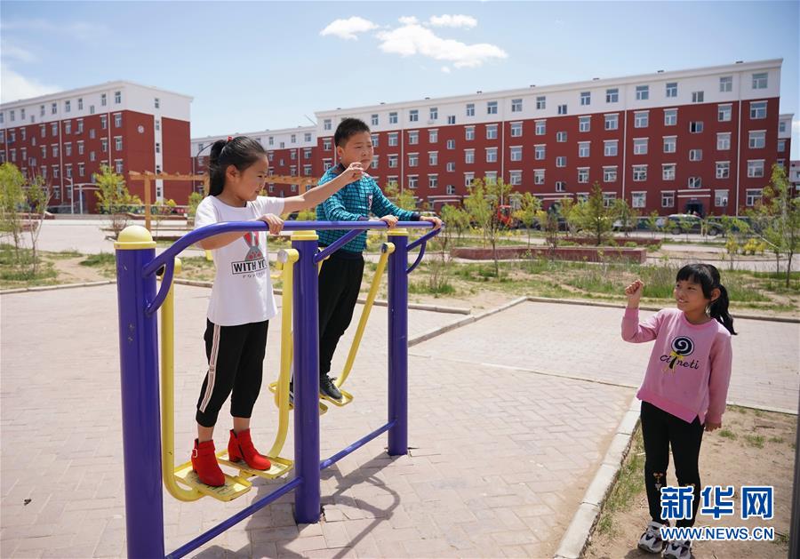 6月2日,兒童在尚義縣大青溝鎮(zhèn)的易地扶貧搬遷集中安置小區(qū)的廣場玩耍。新華社記者楊世堯攝。