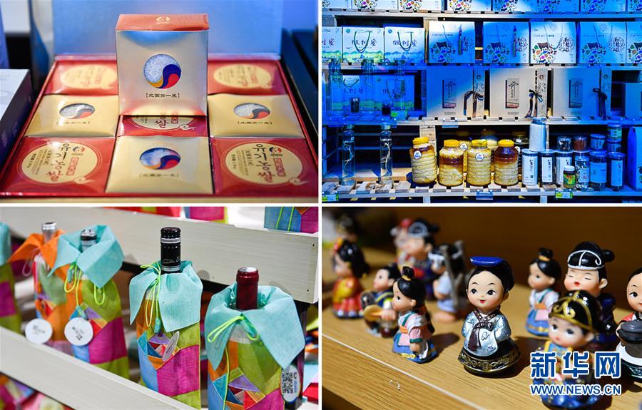 在延邊朝鮮族自治州和龍市“金達萊絲路”電商平臺實體店內拍攝的帶有朝鮮族元素包裝的農特產品及文創(chuàng)產品(拼版照片,5月7日攝)。新華社記者許暢攝。