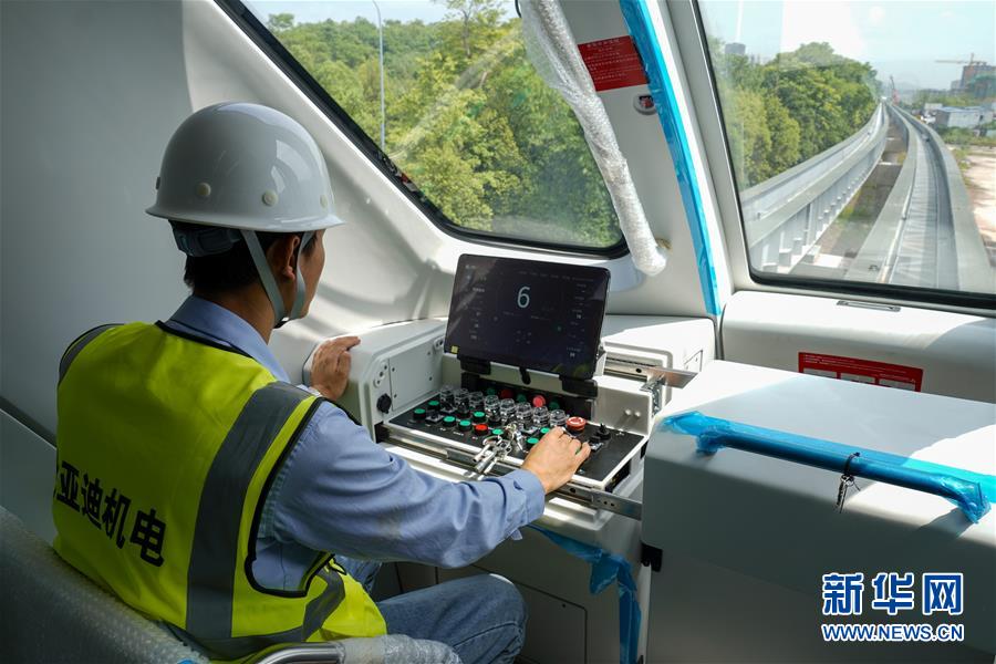 6月3日,工程技術(shù)人員在“云巴”車(chē)廂內(nèi)對(duì)安裝的電氣設(shè)備進(jìn)行調(diào)試。近日,重慶市首條“云巴”示范線項(xiàng)目在重慶璧山區(qū)正式亮相。此次發(fā)布的“云巴”采用電能驅(qū)動(dòng),具有轉(zhuǎn)彎半徑小、爬坡能力強(qiáng)、噪音低、安全性高、建設(shè)成本低、建造周期短等優(yōu)勢(shì),能為乘客提供更智能、舒適、便捷的出行體驗(yàn)。據(jù)介紹,璧山區(qū)“云巴”示范線項(xiàng)目自2019年8月開(kāi)建,線路正線全長(zhǎng)15.4km,共設(shè)車(chē)站15座,預(yù)計(jì)2020年9月全線通車(chē)。新華社記者劉潺攝。