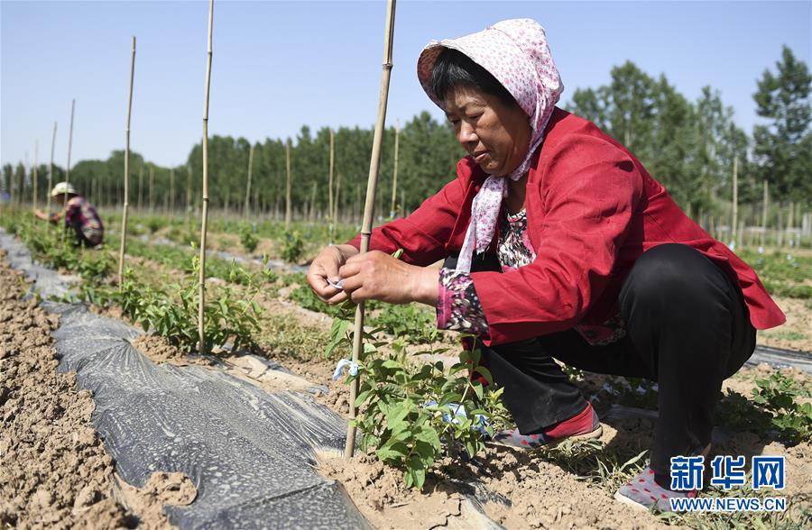 6月3日,村民在深州市魏家橋鎮(zhèn)金銀花種植扶貧基地管理金銀花樹。今年以來,河北省深州市圍繞決勝全面小康、決戰(zhàn)脫貧攻堅(jiān)任務(wù)目標(biāo),在推進(jìn)產(chǎn)業(yè)扶貧的過程中注重激發(fā)內(nèi)生動(dòng)力,通過電商扶貧、扶貧車間、特色種植養(yǎng)殖等多種形式,提升自我“造血”功能,提高貧困群眾受益度。新華社記者李曉果攝。