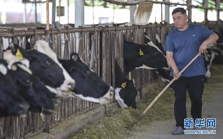 6月3日,村民在深州市榆科鎮(zhèn)郝家莊村奶牛養(yǎng)殖扶貧基地飼喂奶牛。今年以來,河北省深州市圍繞決勝全面小康、決戰(zhàn)脫貧攻堅任務(wù)目標,在推進產(chǎn)業(yè)扶貧的過程中注重激發(fā)內(nèi)生動力,通過電商扶貧、扶貧車間、特色種植養(yǎng)殖等多種形式,提升自我“造血”功能,提高貧困群眾受益度。新華社記者李曉果攝。