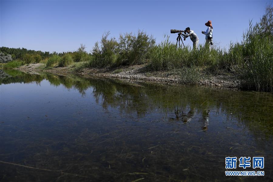 6月3日,李學明(左)和同事在黃河濕地監(jiān)測、拍攝鳥類活動。新華社記者馮開華攝。