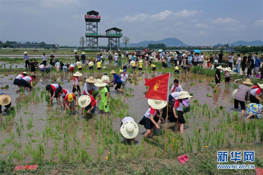 6月7日,孩子和家長(zhǎng)們體驗(yàn)稻田插秧(無(wú)人機(jī)照片)。新華社記者徐昱攝