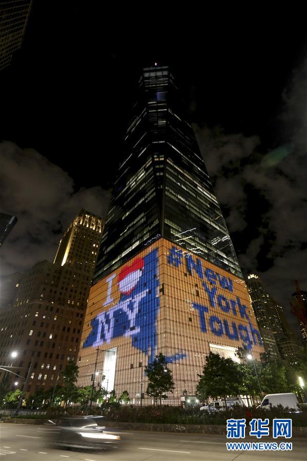 6月7日,美國(guó)紐約世貿(mào)中心一號(hào)樓外墻呈現(xiàn)出“我愛紐約”和“紐約堅(jiān)強(qiáng)”字樣。新華社記者王迎攝