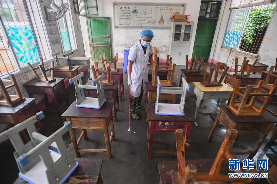 6月8日,在永州市江華瑤族自治縣白芒營鎮(zhèn)車下完全小學(xué),白芒營中心衛(wèi)生院的工作人員在對教室進行消毒。受近日持續(xù)強降雨影響,湖南省永州市江華瑤族自治縣發(fā)生洪澇災(zāi)害。6月8日,永州市江華瑤族自治縣白芒營鎮(zhèn)車下完全小學(xué)開展清淤、消毒工作,為6月9日恢復(fù)上課做準備。新華社記者陳澤國攝