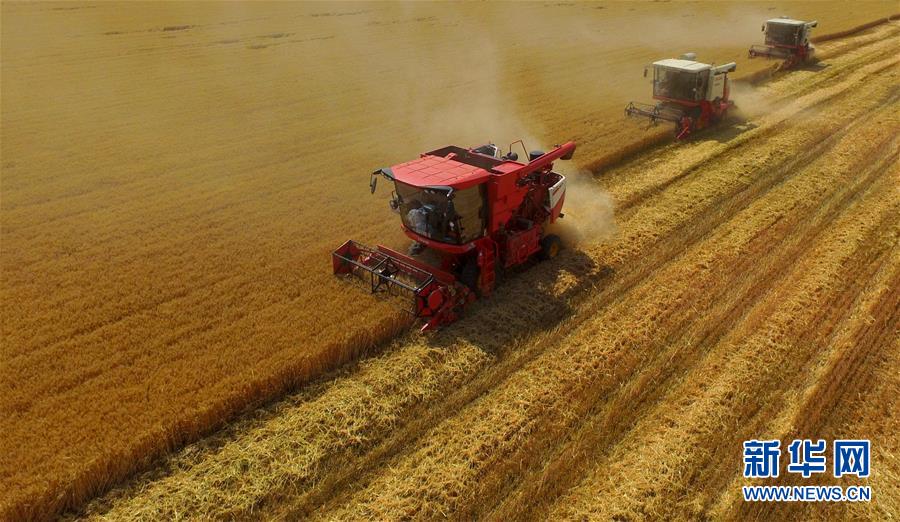 6月8日,聯(lián)合收割機(jī)在河北省南和縣閆里鄉(xiāng)閆里村麥田進(jìn)行夏收作業(yè)(無人機(jī)照片)。“三夏”期間,河北省預(yù)計組織和調(diào)度小麥聯(lián)合收割機(jī)、拖拉機(jī)、夏玉米播種機(jī)等200萬臺農(nóng)業(yè)機(jī)械投入作業(yè)。新華社記者朱旭東攝