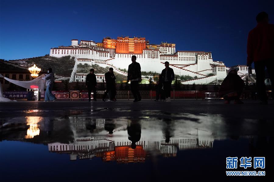 人們?cè)诓歼_(dá)拉宮廣場(chǎng)拍照(6月8日攝)。夜幕降臨,西藏拉薩布達(dá)拉宮燈光璀璨,夜景迷人。新華社記者詹彥攝