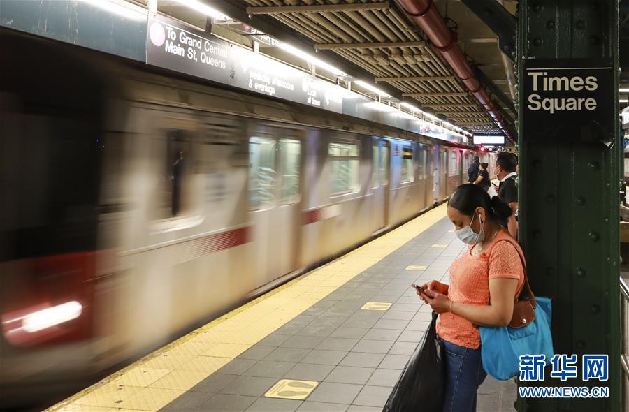 6月8日,佩戴口罩的乘客在美國紐約一地鐵站內等車,地面上安置了保持社交距離的標記。在因新冠疫情進入“居家令”近三個月之后,美國紐約市于當?shù)貢r間8日開始“解封”,進入經濟重啟的第一階段。新華社記者王迎攝
