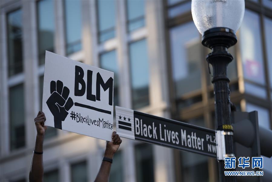 6月8日,一名男子在美國(guó)華盛頓白宮附近手舉“黑人的命也是命”的抗議標(biāo)語。新華社記者劉杰攝