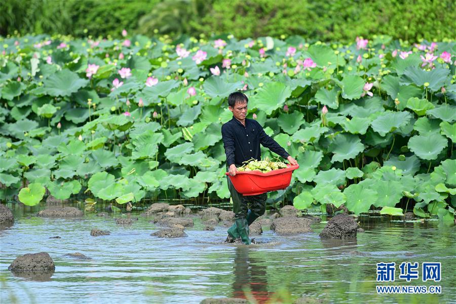 6月9日,村民在??邶埲A區(qū)龍泉鎮(zhèn)椰子頭村搬運采摘的蓮蓬。初夏時節(jié),位于海南海口龍華區(qū)龍泉鎮(zhèn)的蓮蓬逐漸成熟,當?shù)卮迕窦泳o采摘,一派繁忙景象。新華社記者蒲曉旭攝