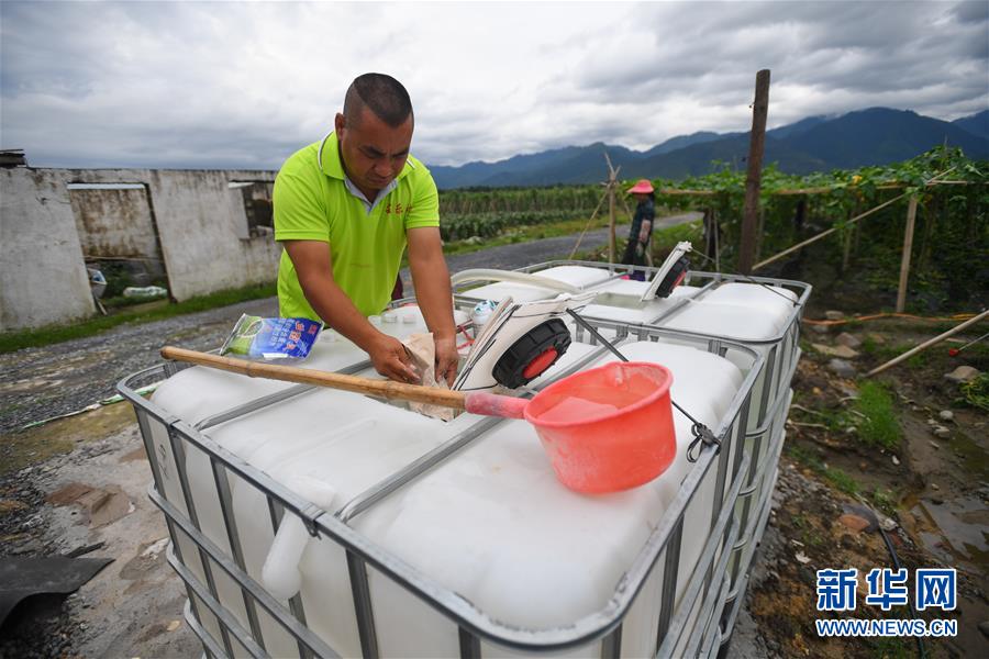 6月9日,在江華瑤族自治縣濤圩鎮(zhèn)鳳尾村蔬菜基地,農(nóng)戶在配制農(nóng)作物消毒水。近日,受連續(xù)強(qiáng)降雨影響,湖南省永州市江華瑤族自治縣遭遇洪澇災(zāi)害,部分農(nóng)田受災(zāi)。目前,江華瑤族自治縣洪水已退,群眾在當(dāng)?shù)叵嚓P(guān)部門引導(dǎo)下積極開展生產(chǎn)自救。新華社記者陳澤國攝