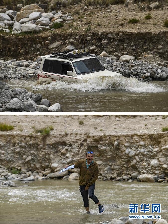 拼版照片:上圖為新疆塔什庫(kù)爾干塔吉克自治縣文工團(tuán)的車輛通過一處涉水路段,前往熱斯喀木村演出;下圖為一名文工團(tuán)演員從水里撿起車輛過河時(shí)被沖掉的車牌(6月5日攝)。新華社記者胡虎虎攝