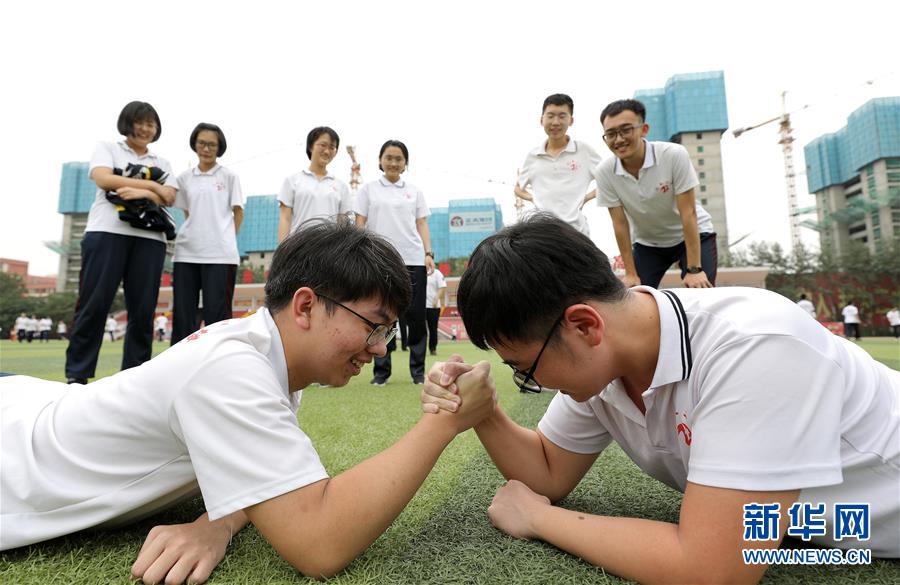 6月9日,河北省衡水市第二中學(xué)的高三學(xué)生在操場進行掰手腕比賽。2020年高考臨近,河北省衡水市第二中學(xué)組織開展多種形式的集體“減壓”活動,幫助高三學(xué)生在緊張備考之余釋放身心壓力,以輕松、樂觀、自信的心態(tài)迎接高考。新華社記者朱旭東攝