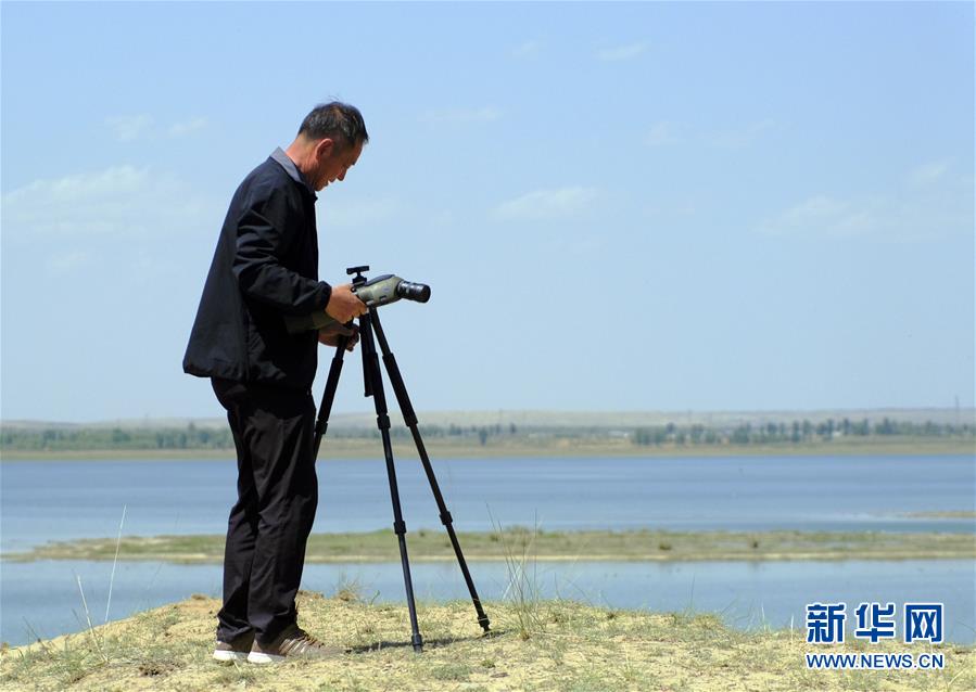 6月9日,鄂爾多斯遺鷗國(guó)家級(jí)自然保護(hù)區(qū)東勝管理站站長(zhǎng)任永奇,用望遠(yuǎn)鏡觀察泊江海子鳥類生活情況。近年來(lái),在當(dāng)?shù)卣亩喾N措施治理下,曾經(jīng)水面萎縮的內(nèi)蒙古自治區(qū)鄂爾多斯市境內(nèi)的泊江海子水量逐漸恢復(fù)。近期,包括遺鷗在內(nèi)的40多種鳥類來(lái)此棲息,泊江海子重新成為鳥類的樂園。新華社記者賈立君攝