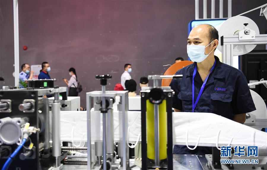 6月10日,參展工作人員站在一臺KN95口罩生產(chǎn)設(shè)備旁。當(dāng)日,廣州國際防疫物資展覽會在保利世貿(mào)博覽館舉行。本次展會面積共計3.6萬平方米,設(shè)有防疫產(chǎn)品、設(shè)備、綜合服務(wù)、原輔料等4個展區(qū),參展企業(yè)約600家。新華社記者鄧華攝