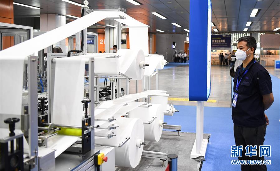 6月10日拍攝的展會(huì)上的一臺口罩生產(chǎn)設(shè)備。當(dāng)日,廣州國際防疫物資展覽會(huì)在保利世貿(mào)博覽館舉行。本次展會(huì)面積共計(jì)3.6萬平方米,設(shè)有防疫產(chǎn)品、設(shè)備、綜合服務(wù)、原輔料等4個(gè)展區(qū),參展企業(yè)約600家。新華社記者鄧華攝