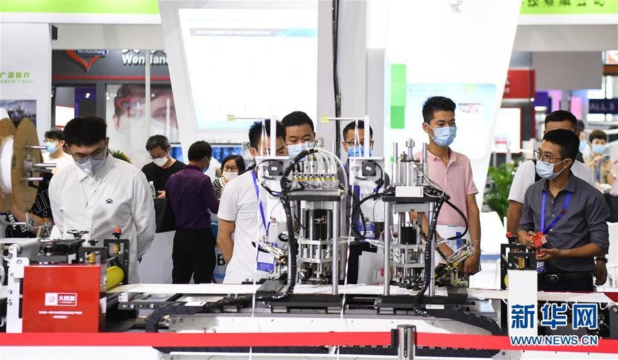 6月10日,觀眾參觀展會(huì)上的一臺口罩生產(chǎn)設(shè)備。當(dāng)日,廣州國際防疫物資展覽會(huì)在保利世貿(mào)博覽館舉行。本次展會(huì)面積共計(jì)3.6萬平方米,設(shè)有防疫產(chǎn)品、設(shè)備、綜合服務(wù)、原輔料等4個(gè)展區(qū),參展企業(yè)約600家。新華社記者鄧華攝