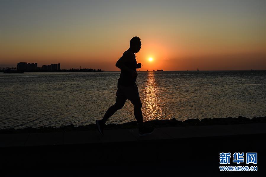 夜幕將至,一位市民在海口世紀(jì)公園濱海步道跑步(5月15日拍攝)。近年來(lái),夜跑成為越來(lái)越多都市人熱衷的健身方式之一。在海南???,每當(dāng)夜幕降臨,“夜跑族”來(lái)到??谌f(wàn)綠園、世紀(jì)公園等夜跑場(chǎng)所跑步,用一身酣暢淋漓的汗水?dāng)[脫白天工作中的壓力,享受跑步帶來(lái)的歡愉。新華社記者 蒲曉旭 攝