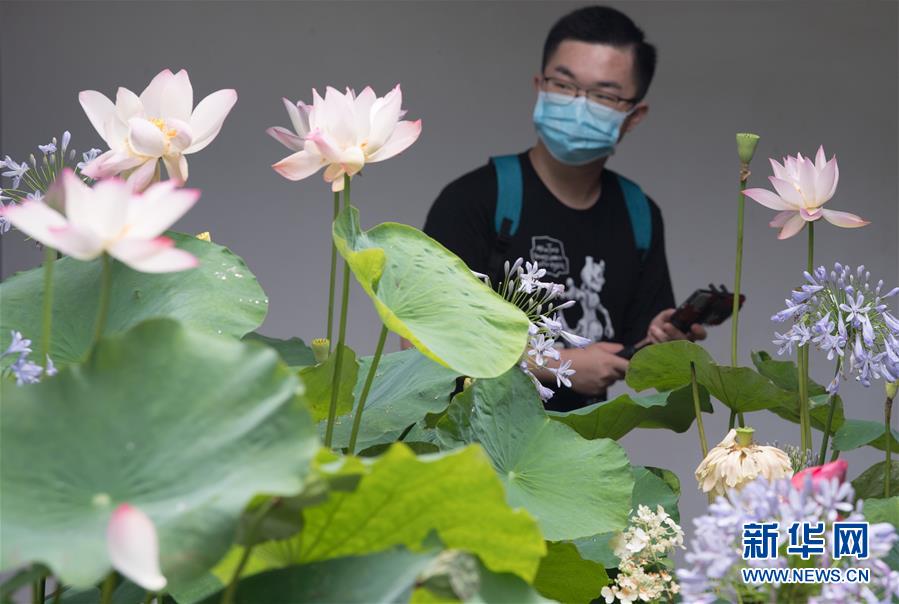 6月12日,游人在西湖郭莊觀(guān)看荷展。隨著氣溫升高,杭州西湖荷花次第開(kāi)放,引得游人駐足。新華社記者 翁忻旸 攝