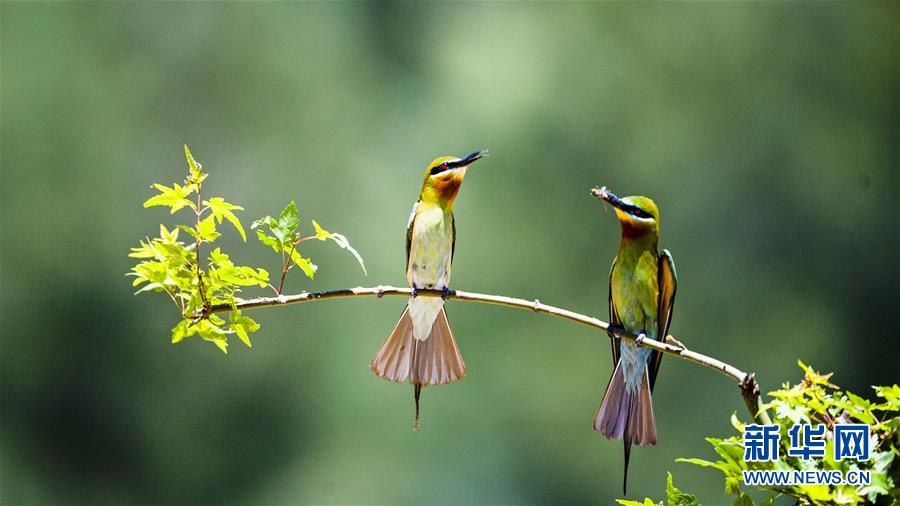 栗喉蜂虎在福建省晉江市深滬鎮(zhèn)科任村一山坡上覓食嬉戲(6月12日攝)。入夏以來(lái),逾百只栗喉蜂虎飛臨閩南晉江市深滬鎮(zhèn)科任村筑巢棲息。新華社記者記者梅永存攝。